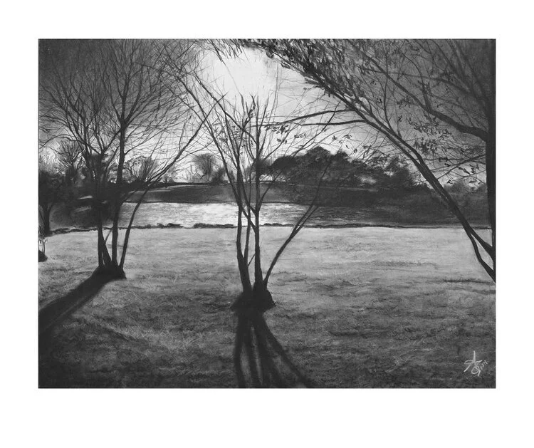 “I create pieces using charcoal to strip down my work to the basic elements of light and dark, texture, and above all, detail. While I appreciate using other media, working with mediums that limit my color palette to black and white is challenging. I see powerful detail in landscapes and I want my work to encourage my viewers to go out and observe the natural environment. My goal is to capture a scene that feels so simple, yet contains so much.”